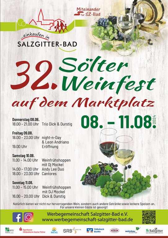 Das 32. Sölter Weinfest findet vom 08. bis 11. August 2024 auf dem Marktplatz von Salzgitter-Bad statt.