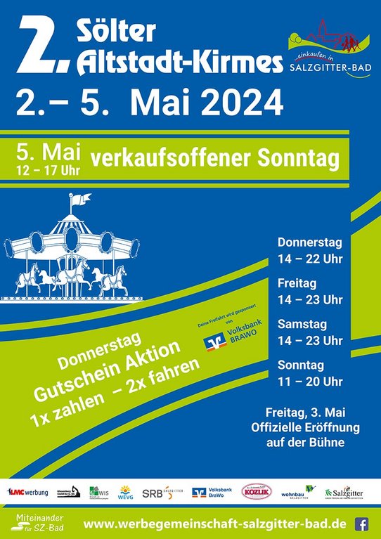 Der 2. Sölter Altstadt-Kirmes findet vom 02. bis 05. Mai 2024 in der Innenstadt von Salzgitter-Bad statt.