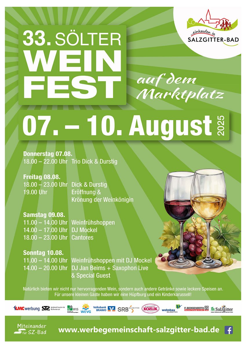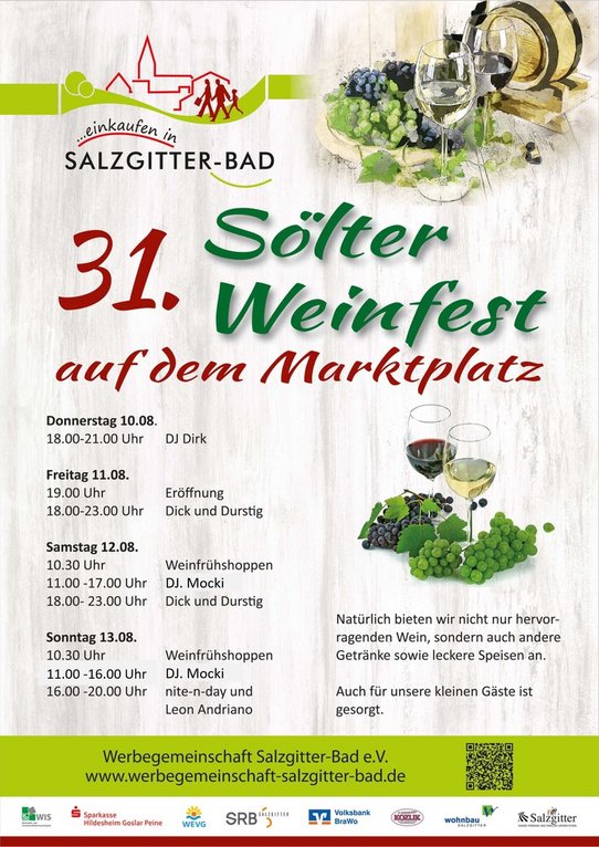 Das 33. Sölter Weinfest findet vom 07 bis 10. August 2025 auf dem Marktplatz von Salzgitter-Bad statt.