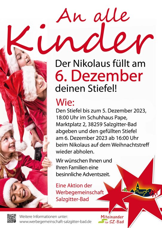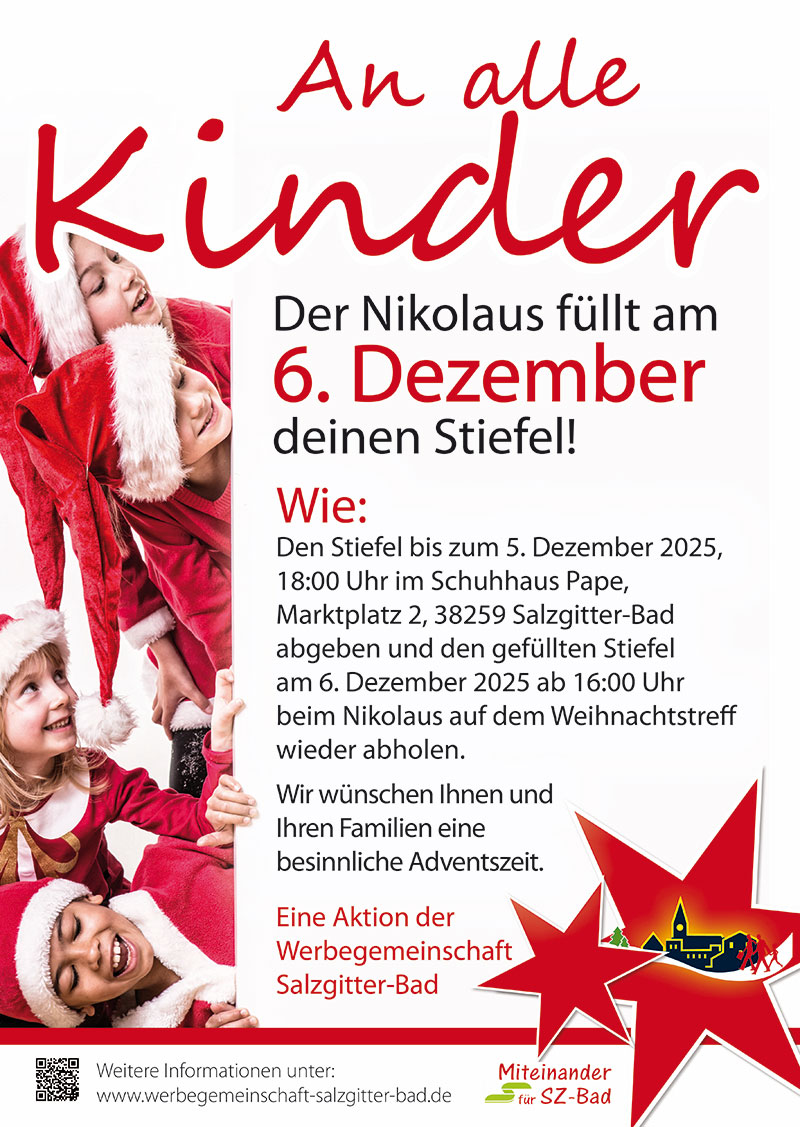 Den Stiefel bis zum 5. Dezember 2025, 18:00 Uhr im Schuhhaus Pape, Marktplatz 2, 38259 Salzgitter-Bad abgeben und den gefüllten Stiefel am 6. Dezember 2025 ab 16:00 Uhr auf dem Weihnachtstreff wieder abholen.
